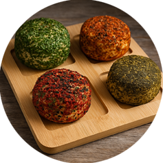 Zioła i przyprawyKażdy krążek sera jest ręcznie obtaczany w aromatycznych mieszankach przypraw — od czarnuszki po paprykę i czubrycę — tworząc unikalny profil smakowy.