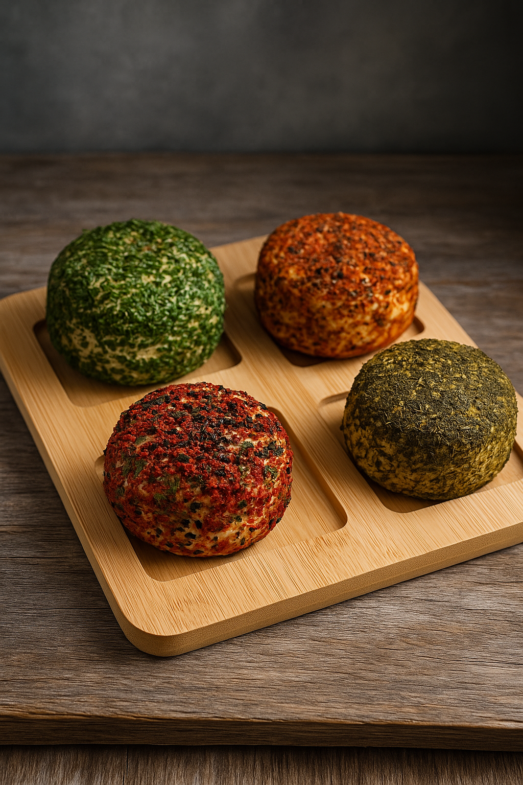 Zioła i przyprawyKażdy krążek sera jest ręcznie obtaczany w aromatycznych mieszankach przypraw — od czarnuszki po paprykę i czubrycę — tworząc unikalny profil smakowy.