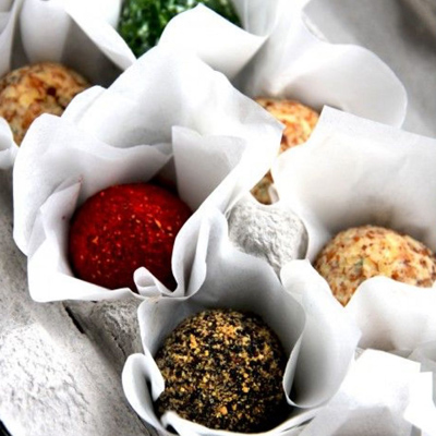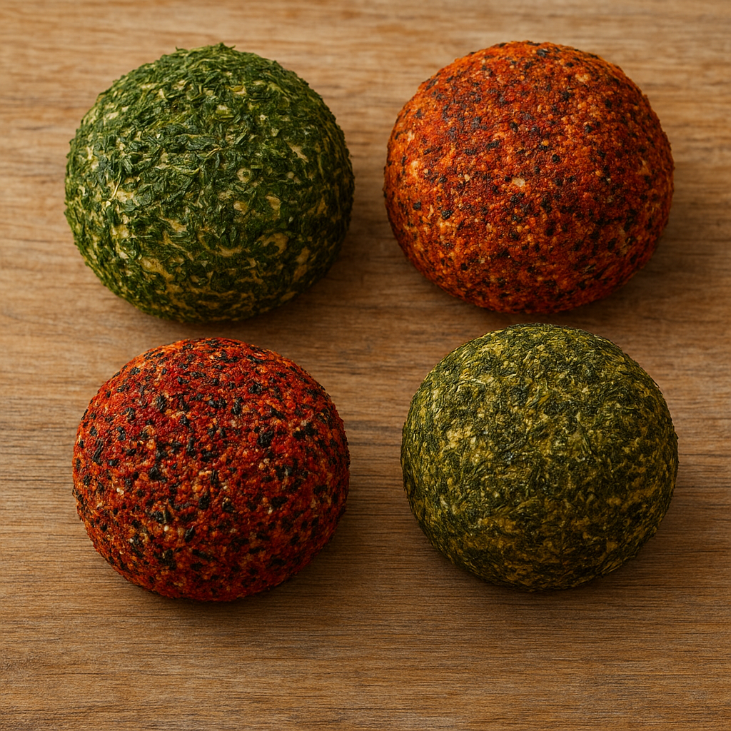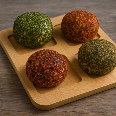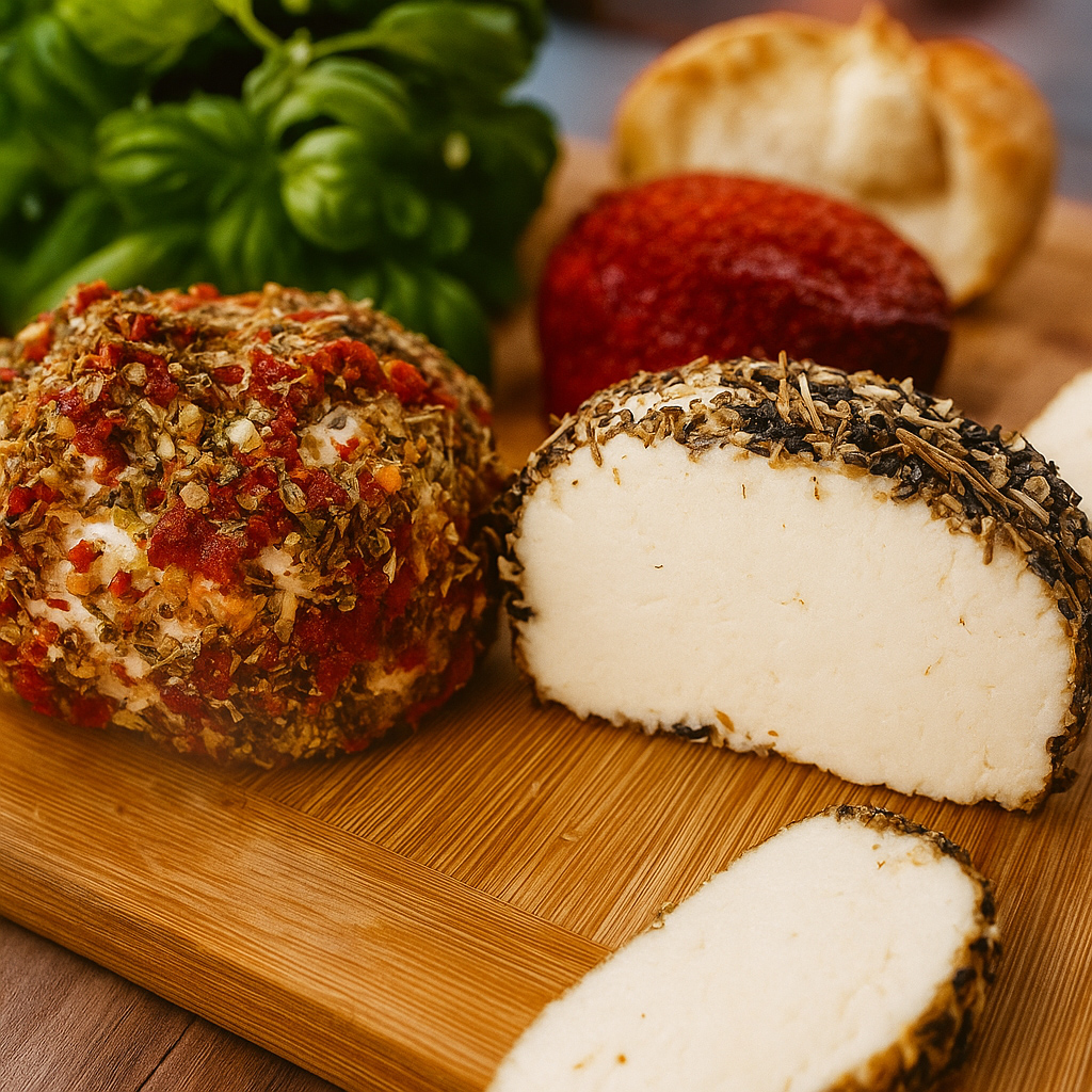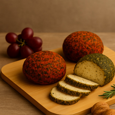 Zioła i przyprawyKażdy krążek sera jest ręcznie obtaczany w aromatycznych mieszankach przypraw — od czarnuszki po paprykę i czubrycę — tworząc unikalny profil smakowy.